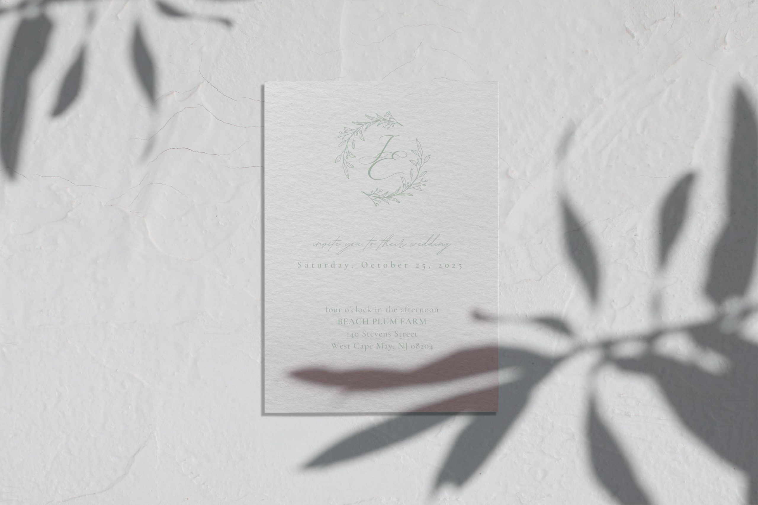 Los elementos botánicos de esta invitación crean una cresta fresca y ligera que rodea las iniciales de los nombres en el centro.